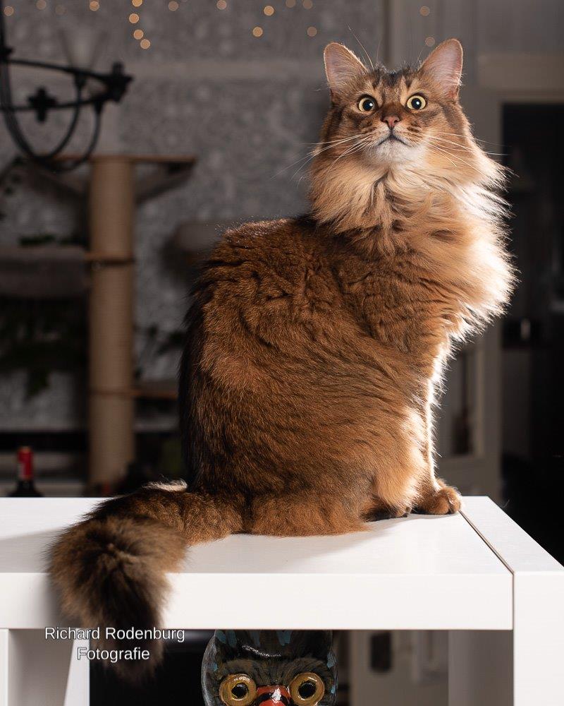 De foto’s: Bodiir op de rugleuning van de bruine stoel toen hij net bij ons was. Foto twee: Bodiir bijna 1 jaar oud op dezelfde plek. Foto drie: De Bodiir look-a-like op de puzzel en de laatste twee foto’s zijn gemaakt door Jan.