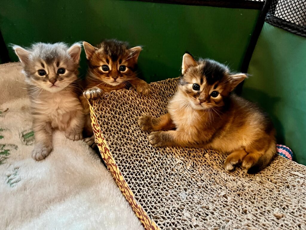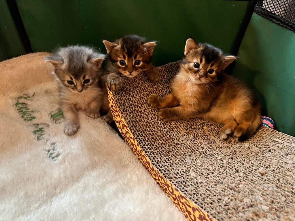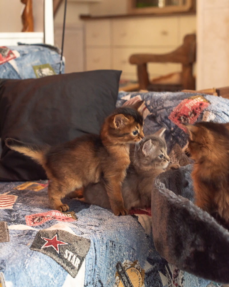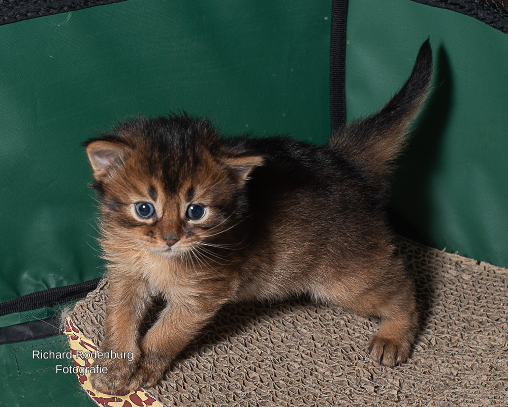 Een mens blijft leren. De les deze keer was dat Sheralyn heus wel met haar kittens in een rennetje wil maar dat dat rennetje gewoon in de voorkamer moet staan. Met het puppyrennetje dat we vanaf de derde levensweek gebruiken kan dat ook wel. Met de grote ren kan dat echter niet. Dan wordt het hier te vol. Sheralyns eerste kittens ‘woonden’ op deze leeftijd al op de bank en ik hield mijn hart vast. Nu gaat het superrelaxt. We zien wel hoe lang we ze hierin kunnen houden. Hun ontwikkeling gaat enorm snel en omdat die allemaal poesjes zijn zal het niet lang duren tot ze uit dit rennetje kunnen klauteren. Het is ook een puppyrennetje. Kittens gebruiken hun nageltjes en zijn er zo uit terwijl puppy’s er nog veel langer braaf in kunnen blijven zitten.