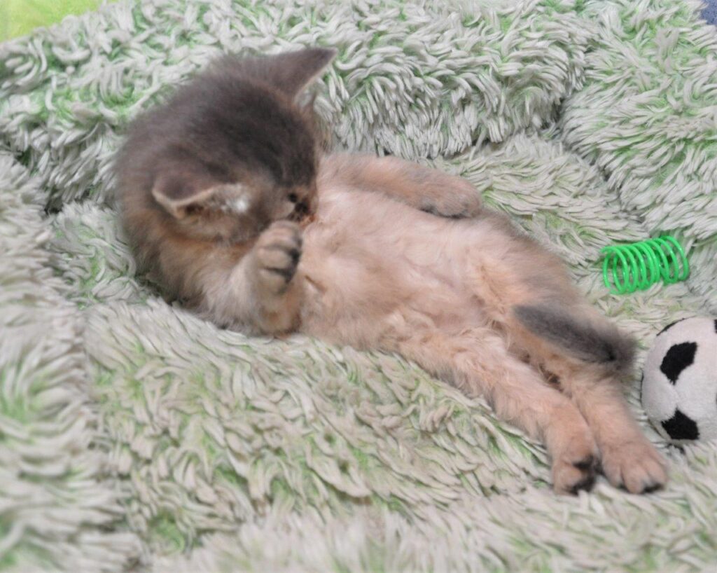 De kittens zijn vrijdag al weer vier weken oud geworden en ze wogen toen alle drie 500 gram. Straks ga ik ze weer even wegen want de stoere Boudica, het blauwe poesje, was wat van slag. Het begon met wat overgeefneigingen zonder resultaat maar uiteindelijk kwam er vieze ontlasting uit. Maar goed dat Sheralyn geen poging had ondernomen om dat op te ruimen. Die kwam vast door de Carnibest die ik ze vanaf vrijdag had gevoerd. Weliswaar mini-beetjes en ze hadden er eigenlijk geen van drieën zin in. Maar even pas op de plaats houden én kattenbakken geven voor het geval dat.