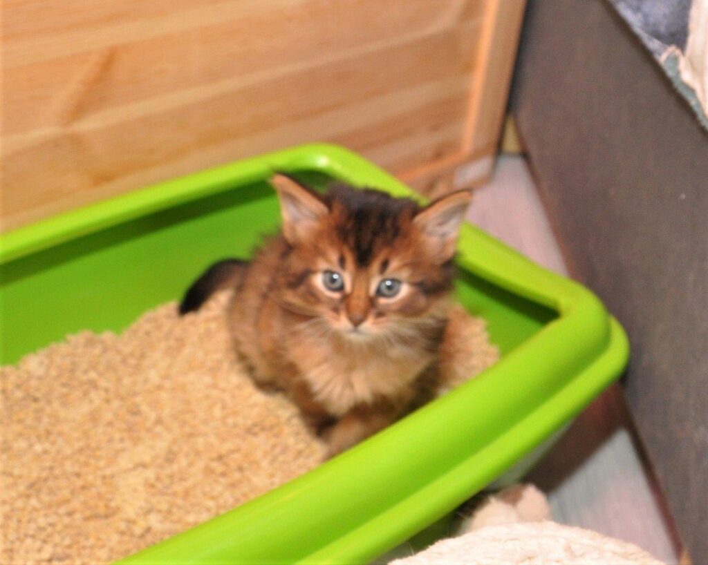 Als volleerd op de kattenbak.