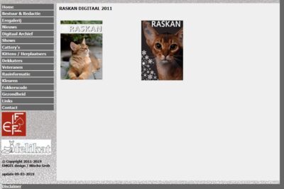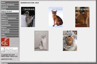 Onze Maverick stond in 2007 op de cover van een Raskanblad. Dit nummer was nog niet digitaal, zelfs niet helemaal in kleur. Alleen de advertenties met vooral foto’s van de mooiste katten waren dat wel. Als uitzondering kreeg ik dit blad met Maverick in kleur op de cover. Het hoe en waarom ervan weet ik niet meer. Mogelijk wilde de drukker de toenmalige redactie overtuigen hoeveel aantrekkelijker het blad daardoor kon worden. En dat is een aantal jaren later gelukt. De vier jaargangen die hieronder staan, zijn in full-color.