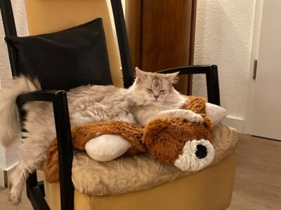 Sheralyn is op 17 augustus gedekt maar aan haar is uiteraard nog weinig te merken anders dan dat ze erg blij was toen ze na haar spannende logeerpartij weer in haar eigen huis was. Na wat extra bunkeren en slapen ging ze verder met haar gangbare bezigheden en dat is vooral veel buiten op het ‘Gluren-naar-de-burenplankje’ zitten. Uitkijken naar een spannende kater hoeft niet meer want de knappe Gio heeft heel goed zijn best gedaan en op 7 september zouden de eerste echte kenmerken van haar zwangerschap zichtbaar moeten worden. De toegenomen eetlust is er al wel eentje die me hoopvol stemt én net kwam ze met een overslaand motortje ouderwets bij me knuffelen. Tot ik een niesbui kreeg.