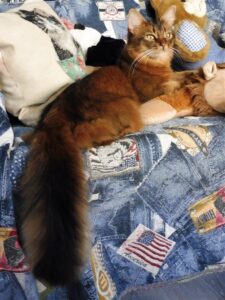 Toevallig stonden er geen verhuisdozen of kratjes met spullen uit de kast op de bank – kon Sheralyn mooi even poseren met haar indrukwekkende staart. Zie de foto links.